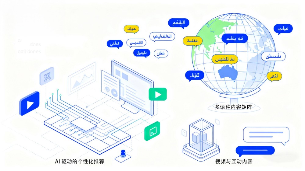 未来英文网站和小语种网站都将更多应用AI技术,根据用户来源、语言和兴趣推荐个性化内容,提高转化率。
